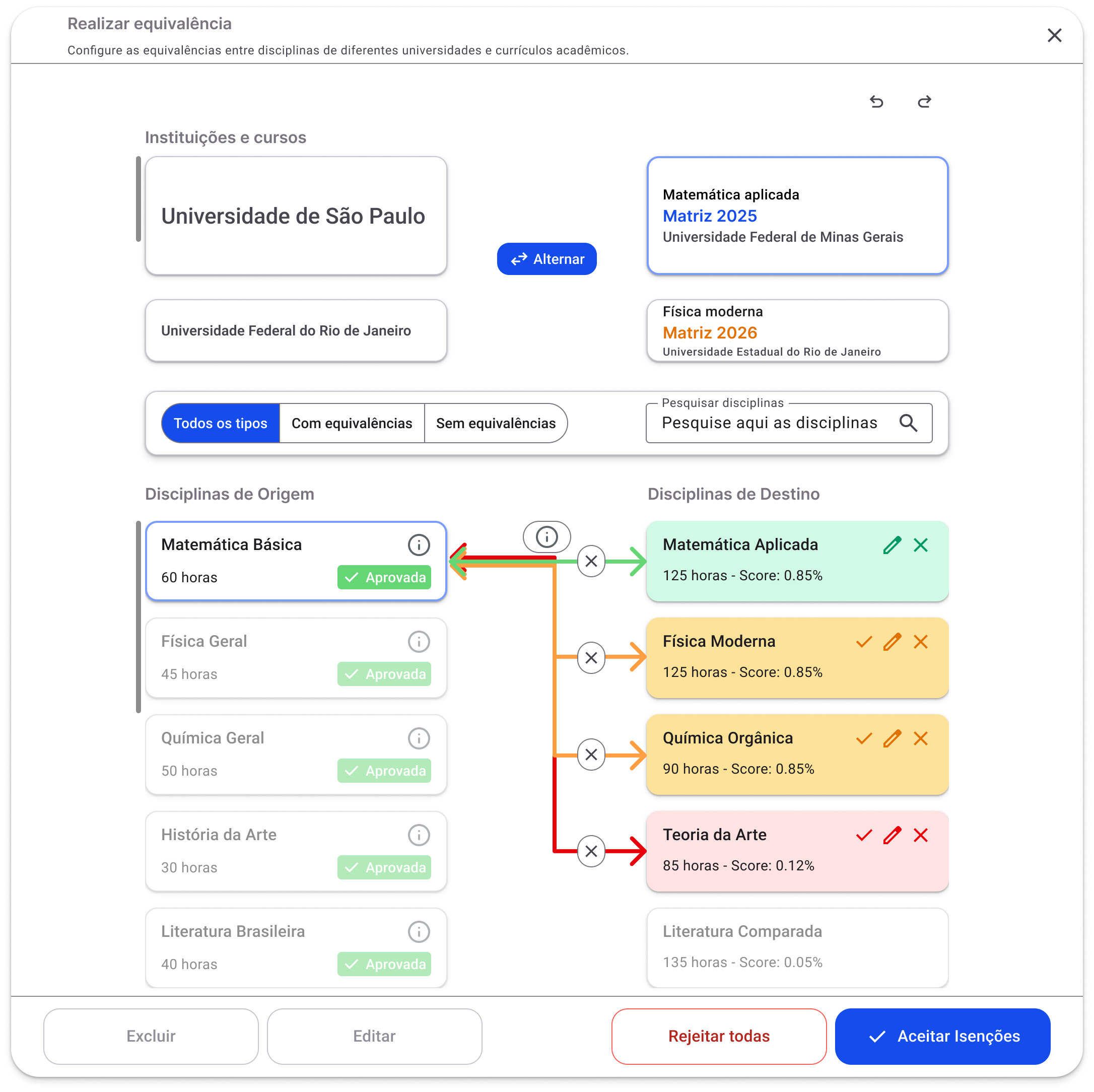 O sistema compara o histórico de origem com a matriz do curso de destino, analisa com precisão a similaridade e sugere as melhores equivalências para cada disciplina.